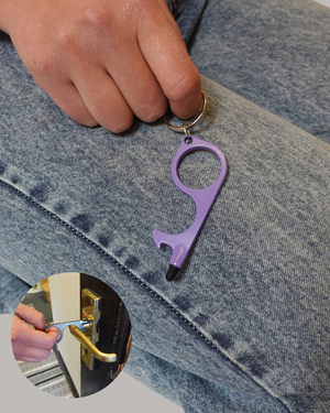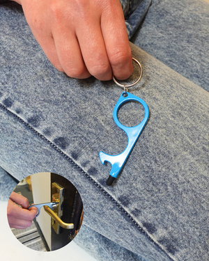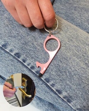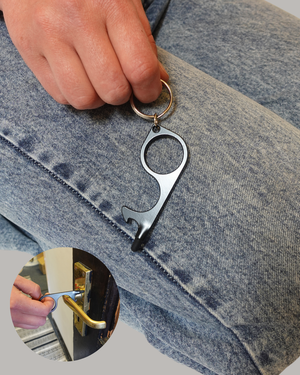 3-in-1 Stylus, Door & Bottle opener — a compact, 1 oz zinc alloy multitool designed for convenience. Easily open doors, push buttons, and flush toilets without direct contact. Measuring 3.15 x 1.2 x 0.15 inches, it's portable and fits in your pocket or bag. The silicone touch tip allows for touch screen use, and it doubles as a bottle opener. Stay germ-free and always prepared with this versatile, contactless key tool!